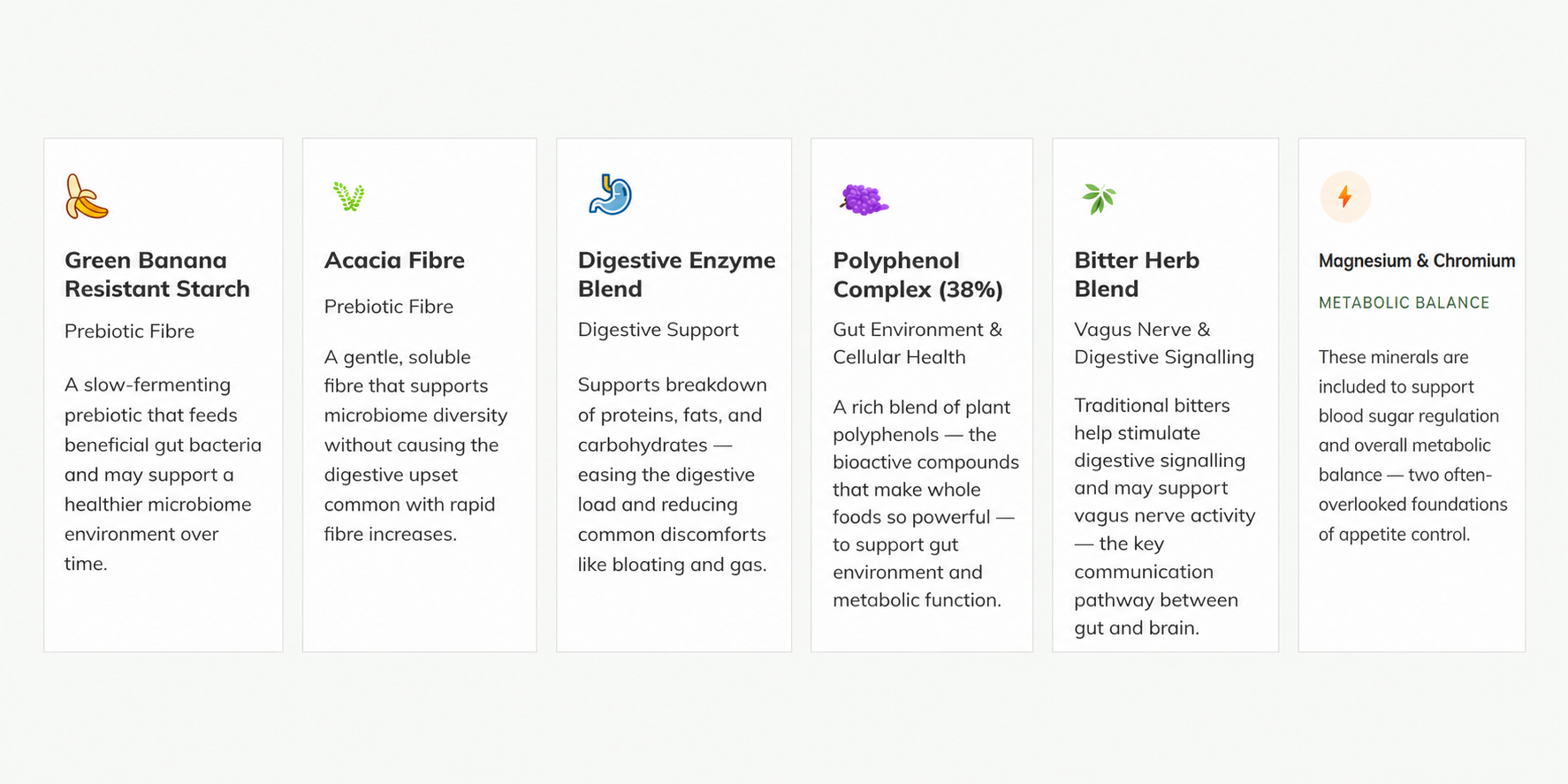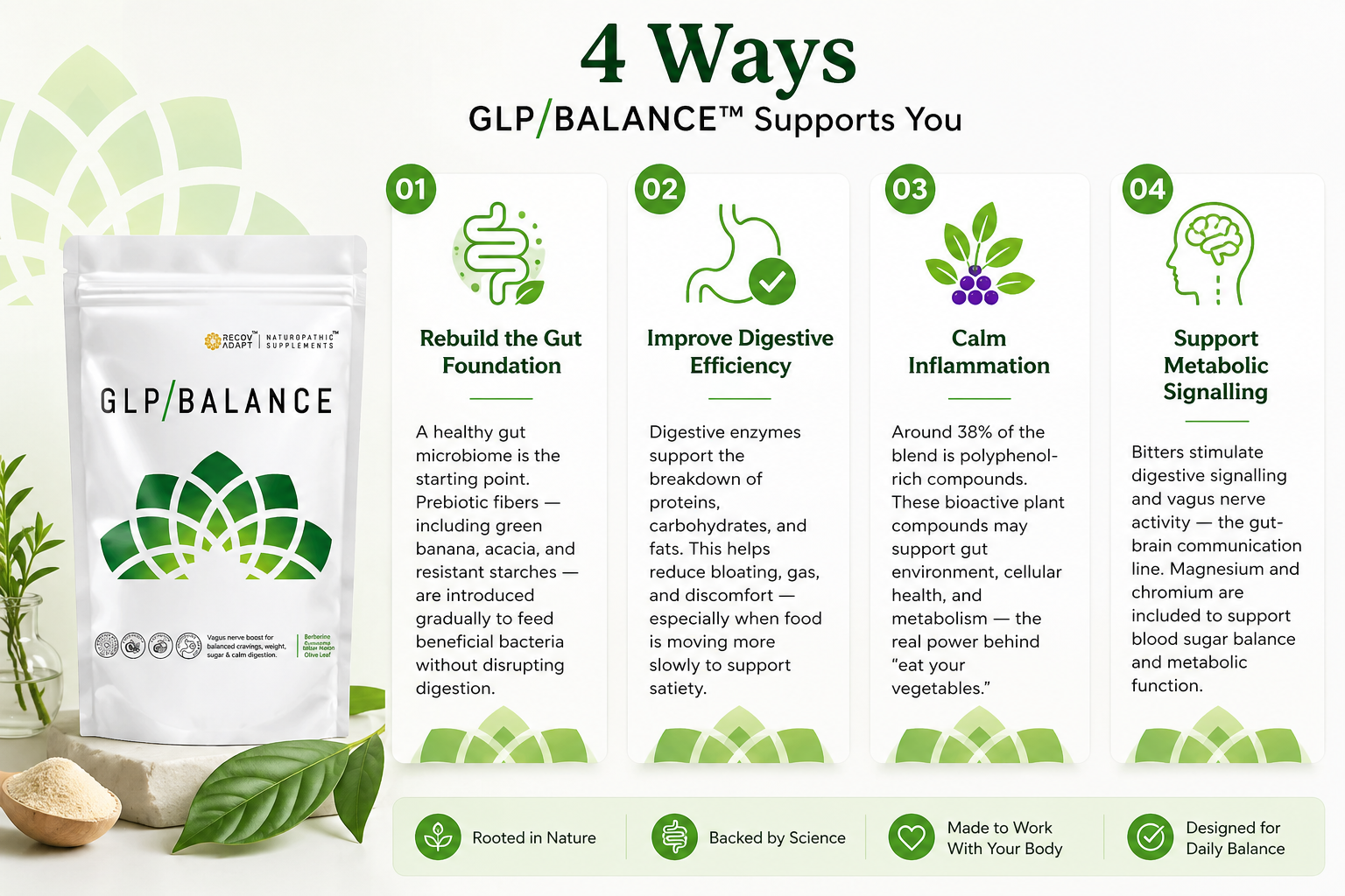 → GLP/Balance is a practitioner-formulated supplement designed to support your body's natural ability to regulate appetite, digestion, and metabolism — all in one formula. Rather than artificially stimulating GLP hormones from the outside, it works by rebuilding the gut environment first, using digestive enzymes, prebiotic fibres (like green banana and acacia), and a 38% polyphenol-rich blend to nourish the microbiome and reduce inflammation. Bitters are included to support vagus nerve activity — the gut-brain communication pathway that signals appetite and satiety — alongside magnesium and chromium for blood sugar balance. The result is a multi-system approach where people often notice reduced cravings, less bloating, and better energy early on, with improved appetite regulation and metabolic function building over time.