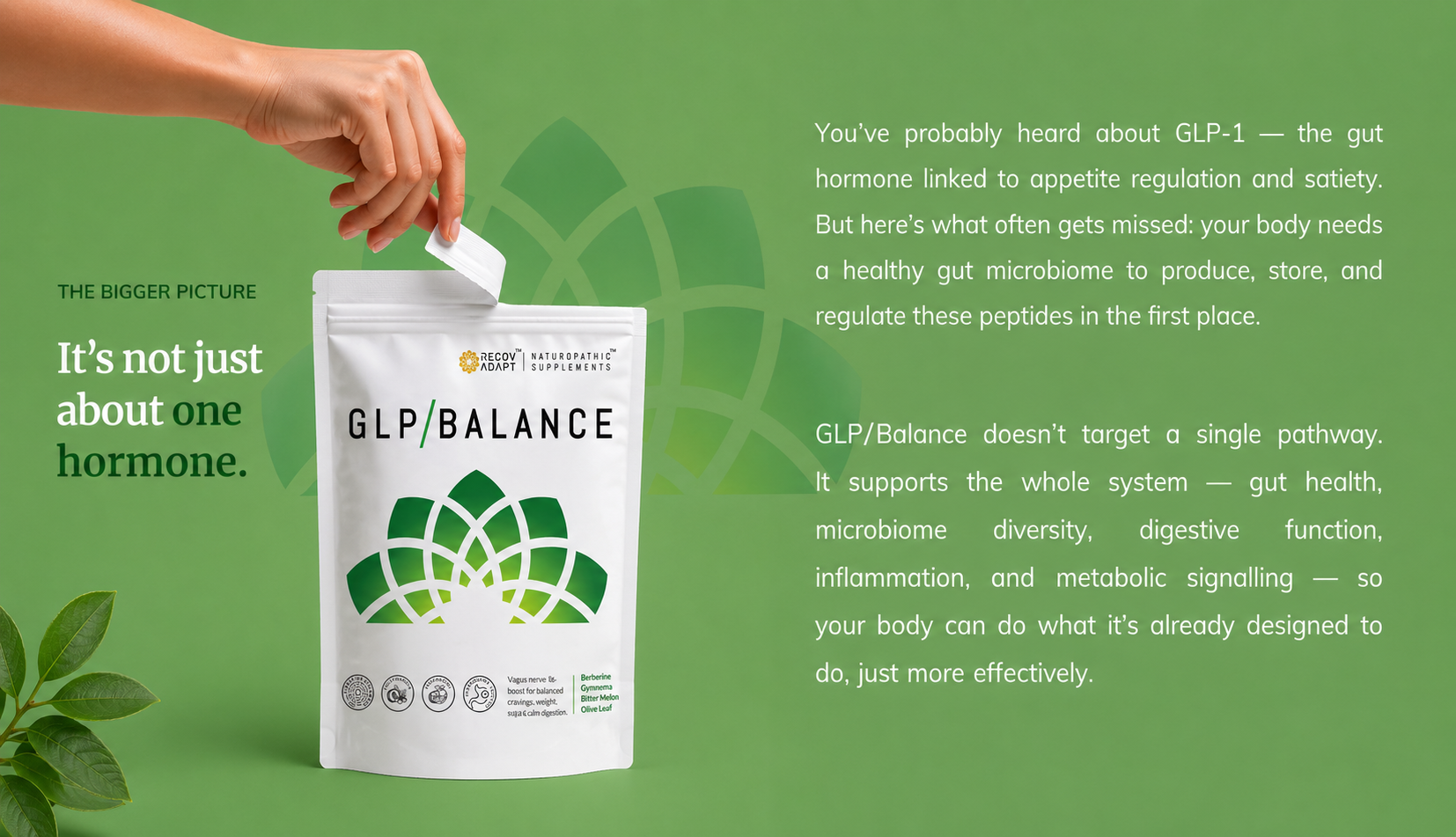 GLP/Balance doesn't attempt to mimic or replace GLP-1. Instead, it supports the gut environment, microbiome health, and metabolic signalling pathways your body uses to naturally produce and regulate these peptides. It's a foundational approach rather than a hormone-targeting one — designed to support your body's own systems working better over time.