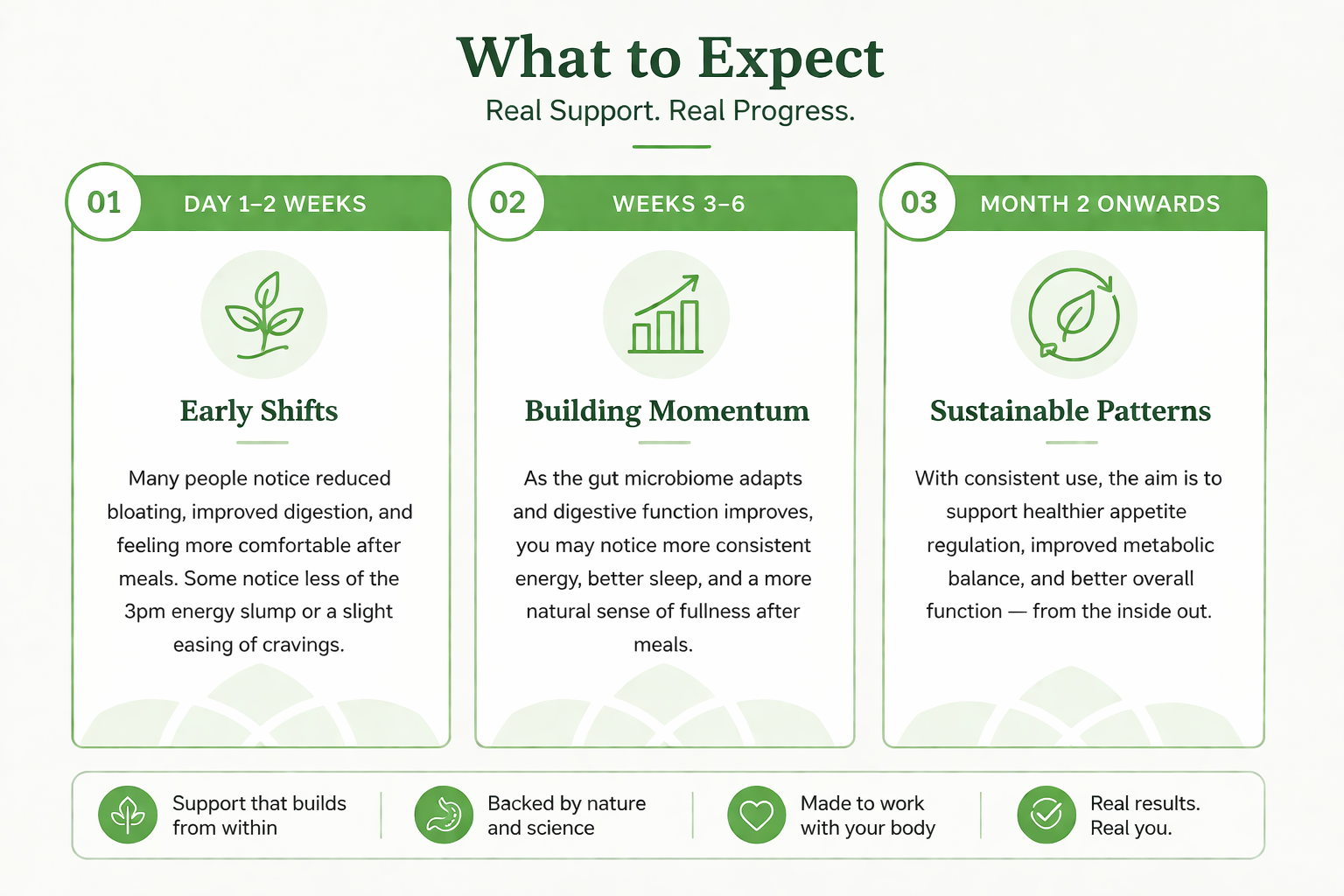 Some people notice mild changes in digestion in the first week as the gut adapts — this is normal and usually settles quickly. The prebiotic fibres in GLP/Balance are introduced in carefully balanced amounts and we recommend starting with the lower end of the dosage range to give your microbiome time to adjust comfortably.